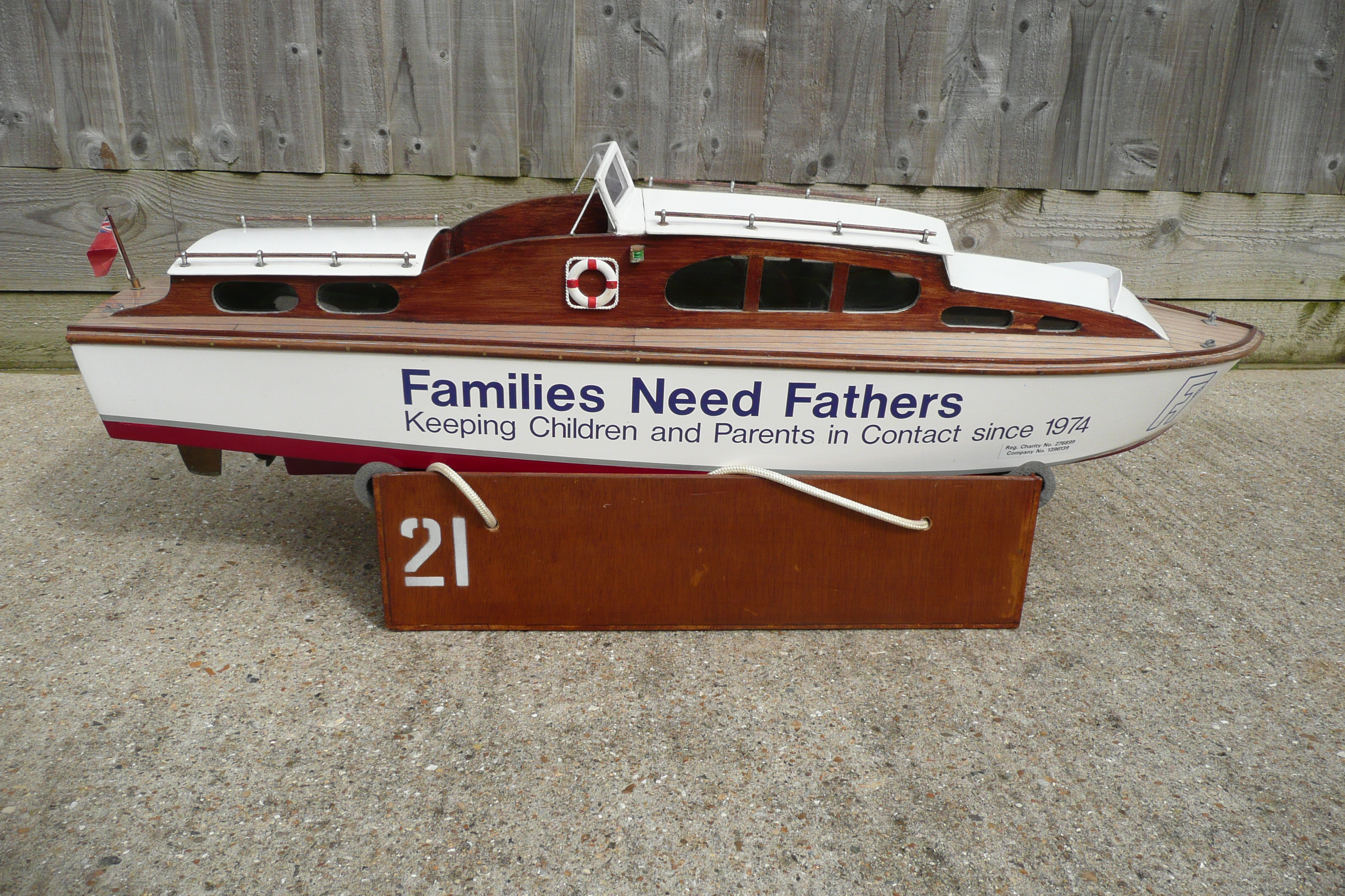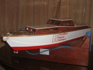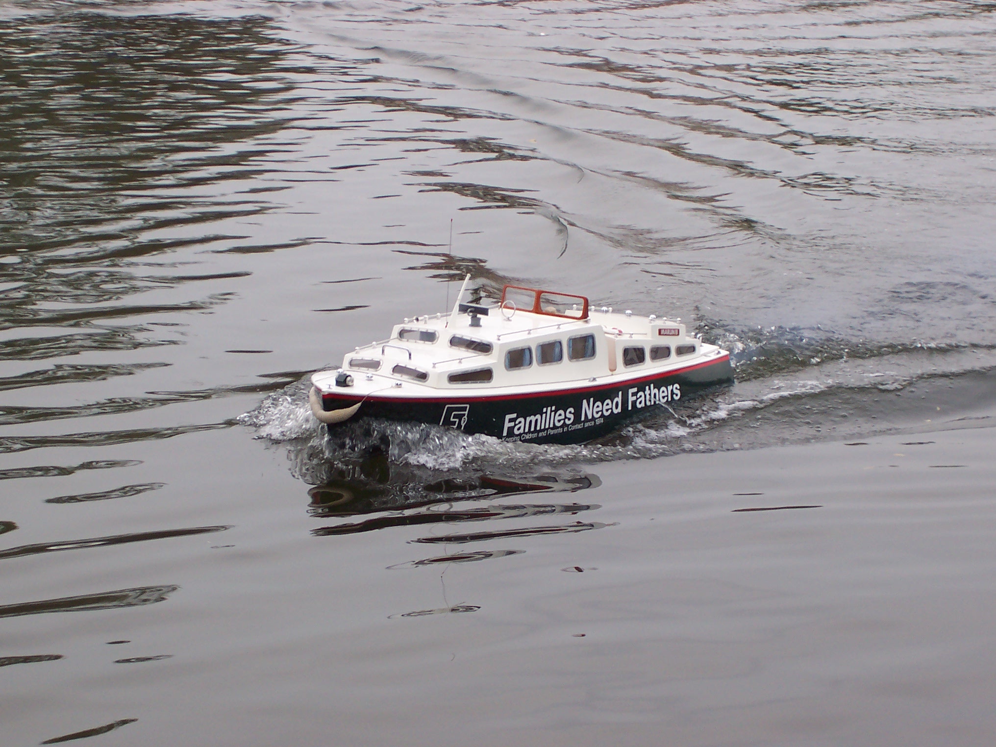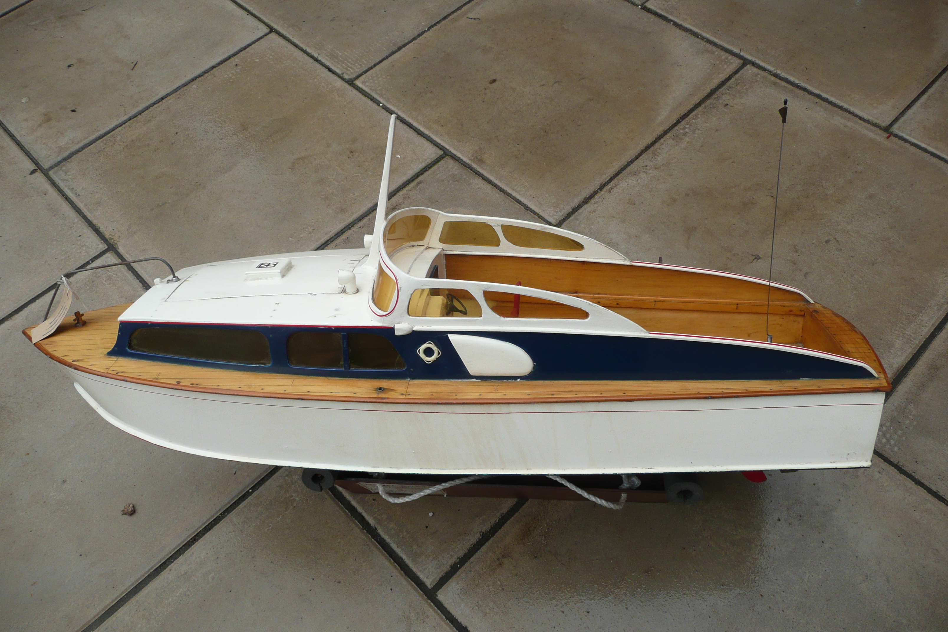 Powered by an MFA 850 motor with water-cooling coil, Electronize 30 amp speed controller and power from a 12v 7amp gell cell battery. The model performs with more than adequate speed. The model is finished in high gloss International Marine enamel and varnish.