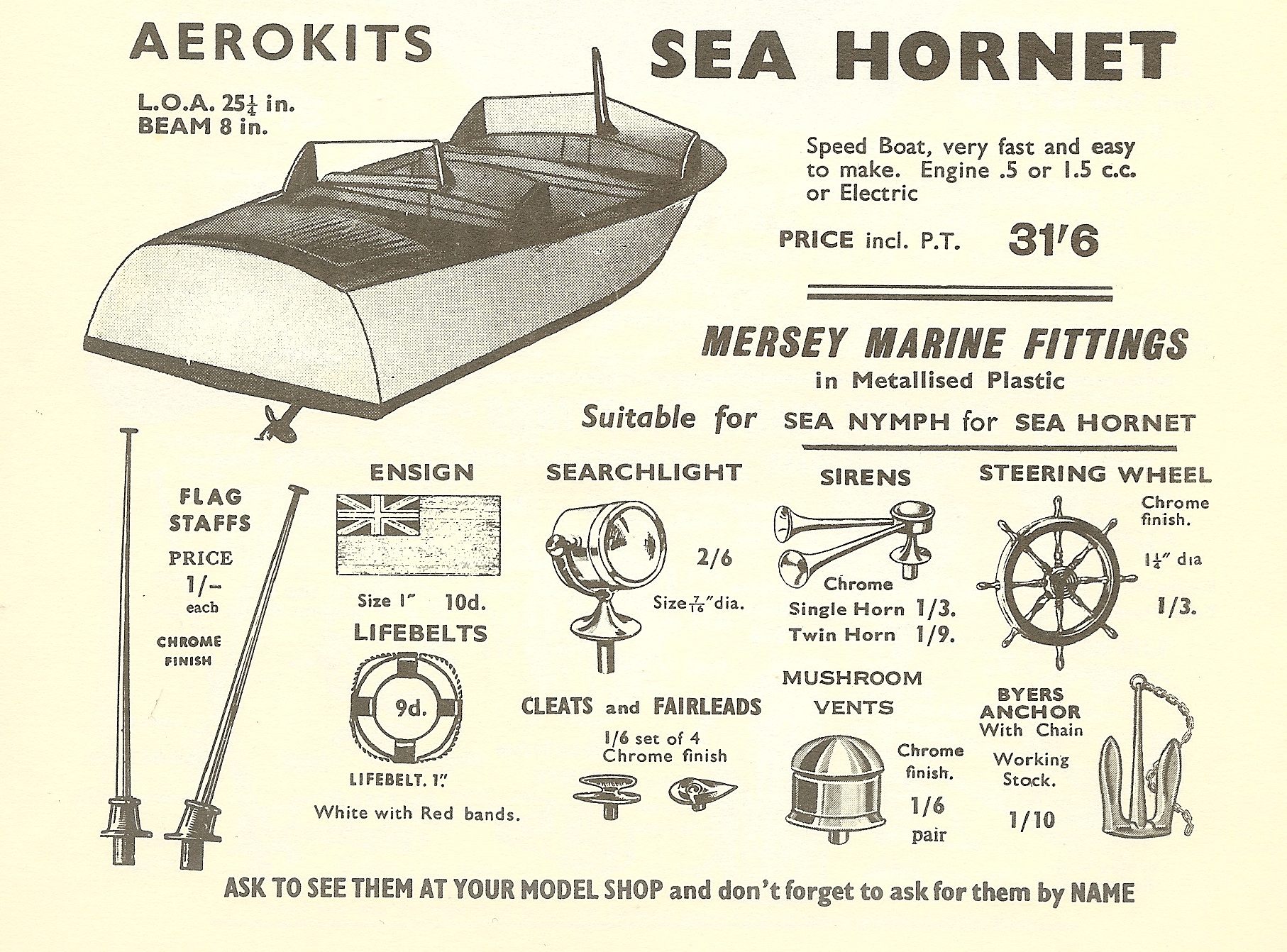 An original advert for the Sea Hornet from the KeilKraft Marine catalogue also showing fittings available at the time.